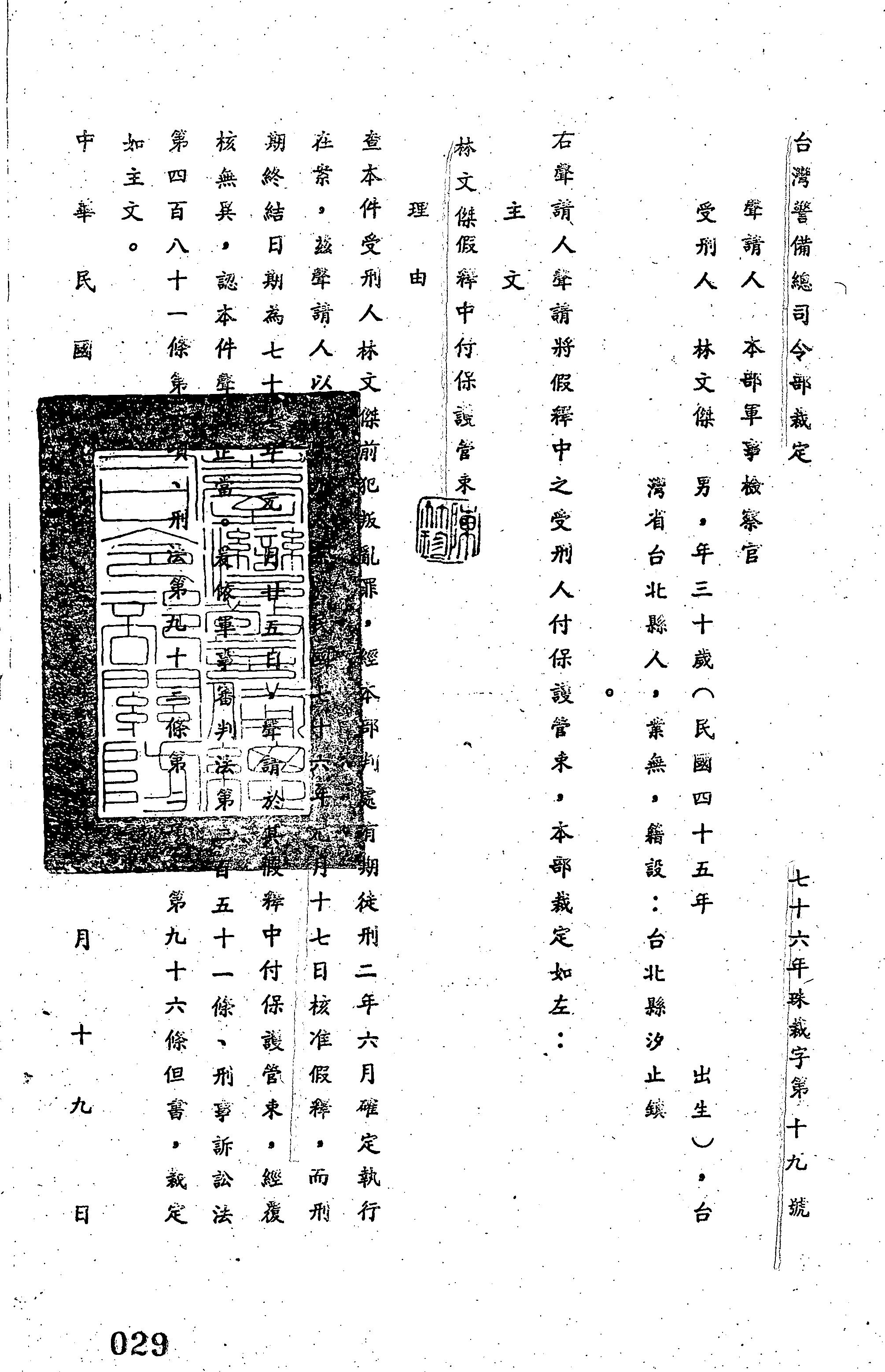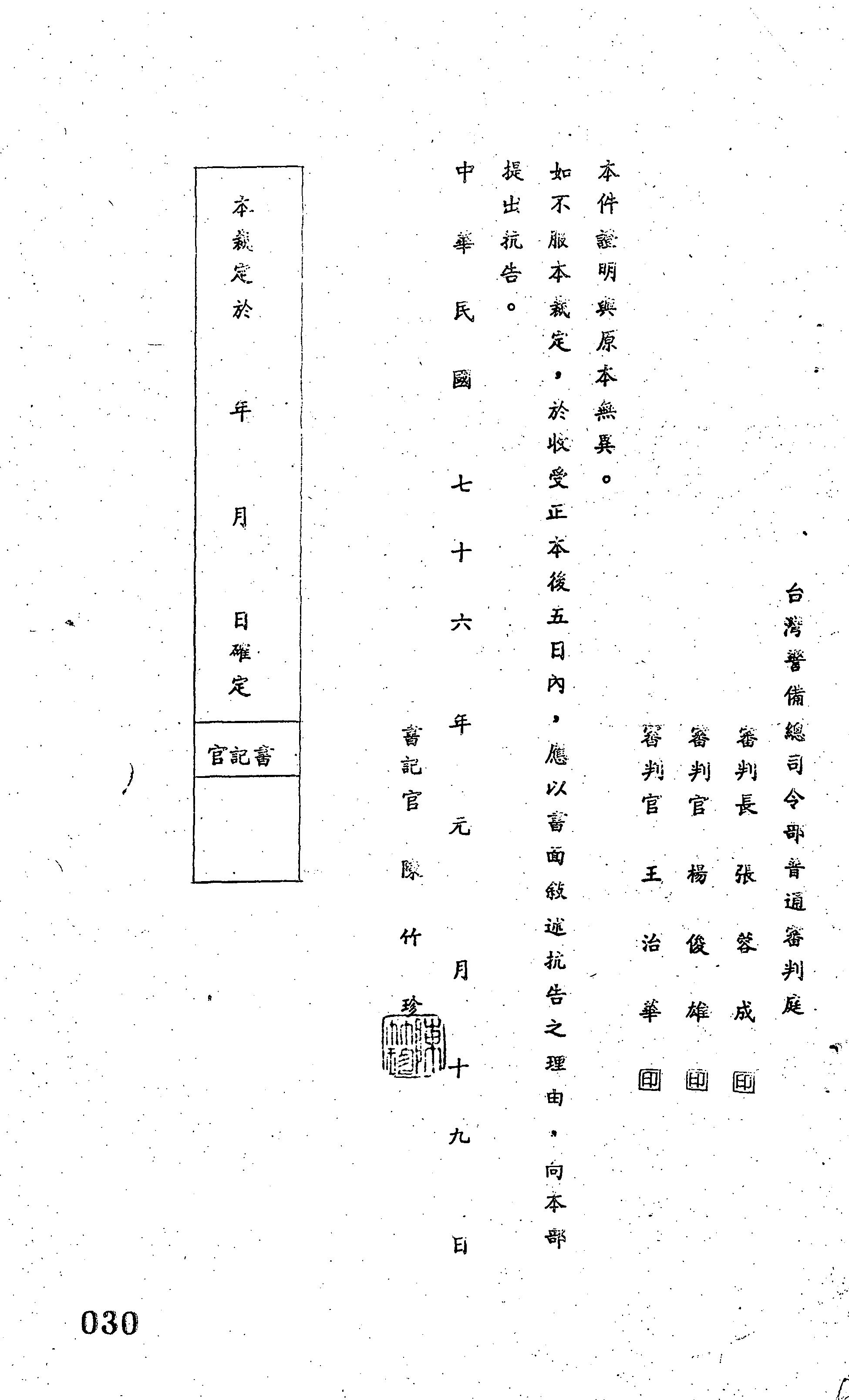 臺灣警備總司令部76年珠裁字第0019號裁定書