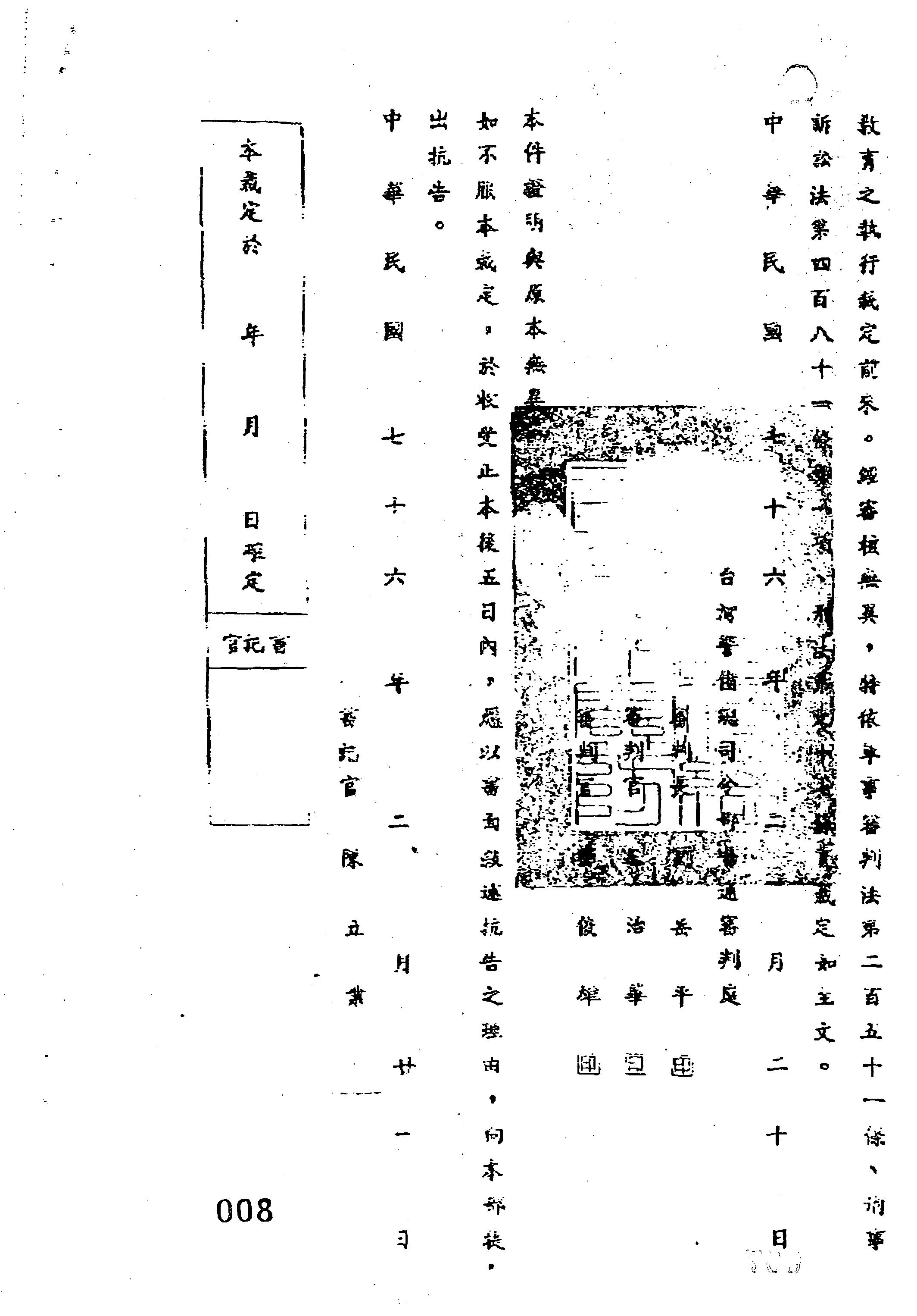 臺灣警備總司令部76年珠裁字第0029號裁定書