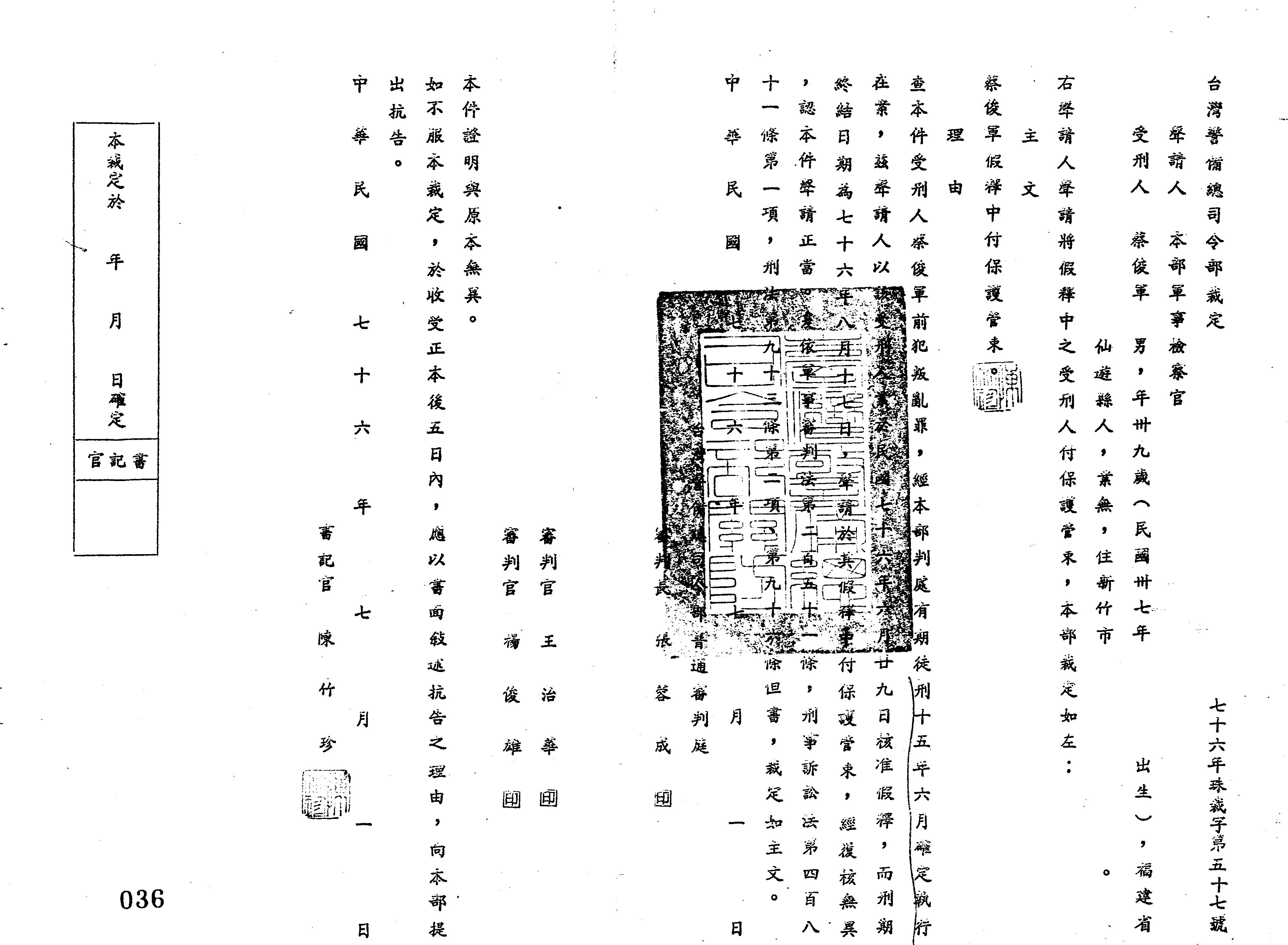 臺灣警備總司令部76年珠裁字第0057號裁定書