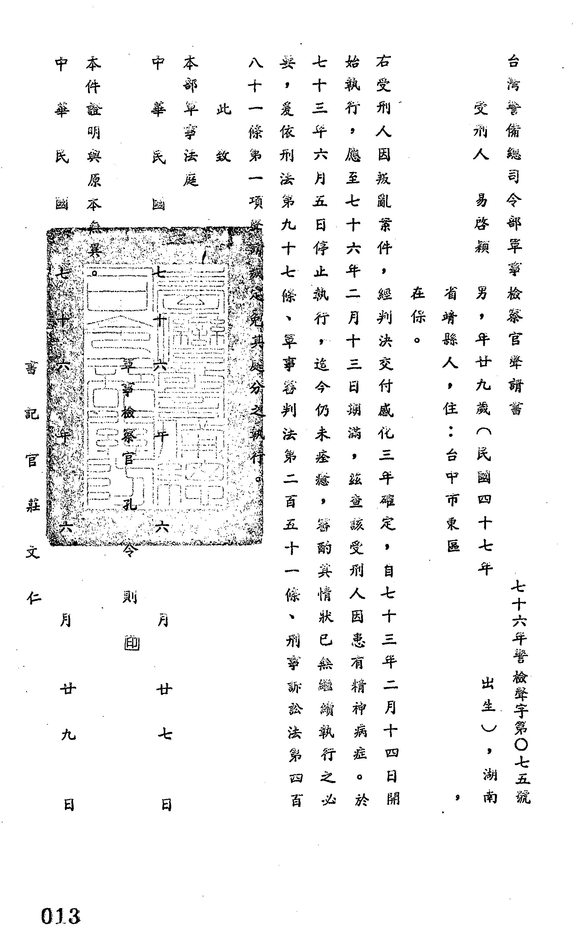 裁判書主文/要旨:易啟穎因叛亂案件經判決交付感化三年,茲查因病未癒審酌其情況已無繼續執行之必要。
