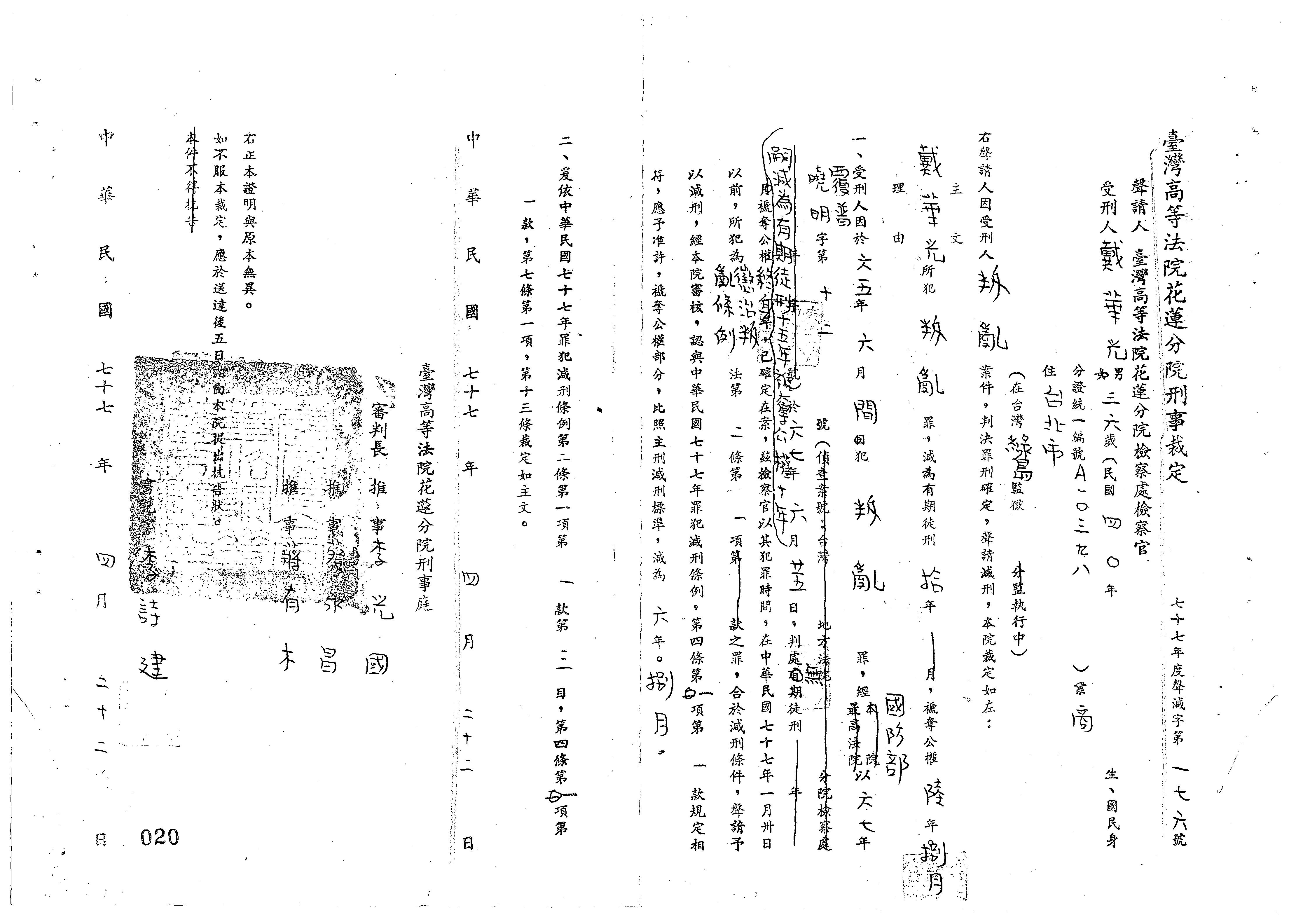 裁判書主文/要旨:戴華光所犯「叛亂罪」,減為有期徒刑10年,褫奪公權6年8月。