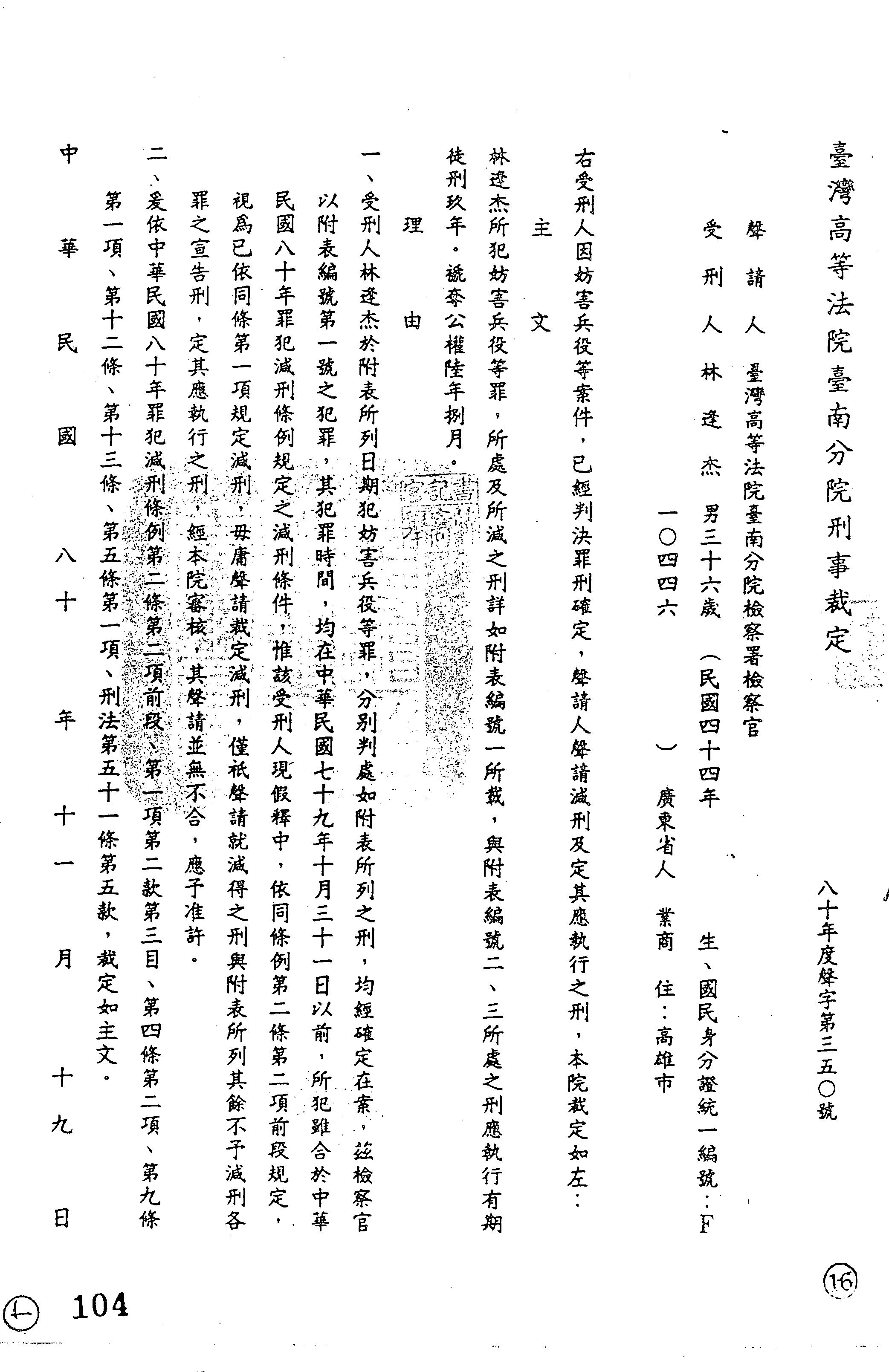 - 裁判書正題名: 臺灣高等法院臺南分院80年聲字第0350號刑事裁定書