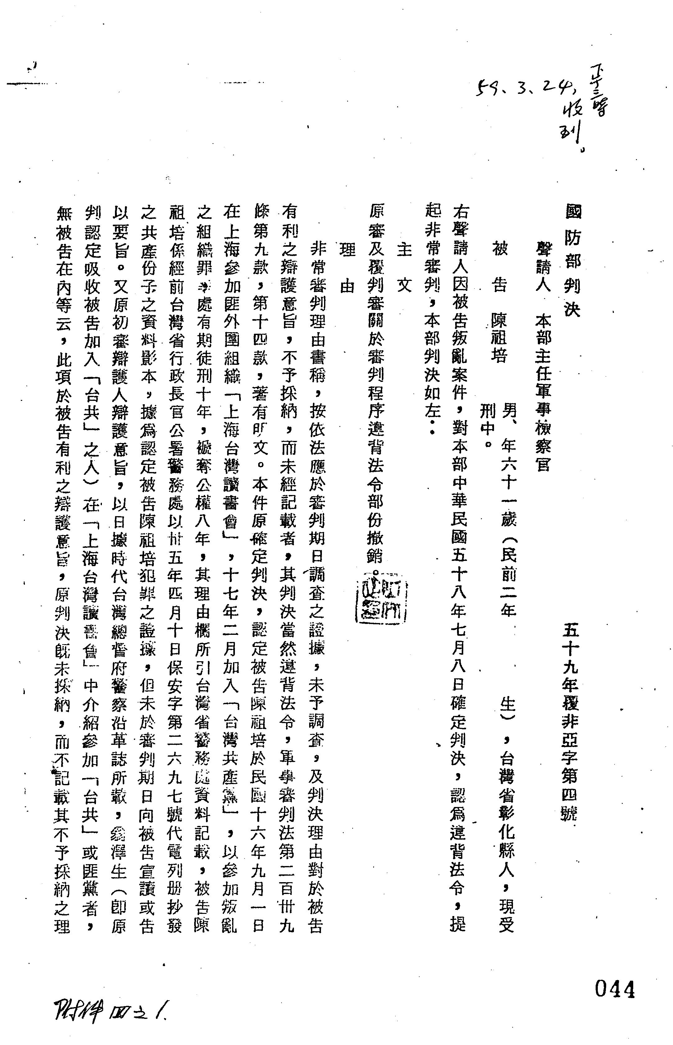 國防部59年覆非亞字第0004號判決書