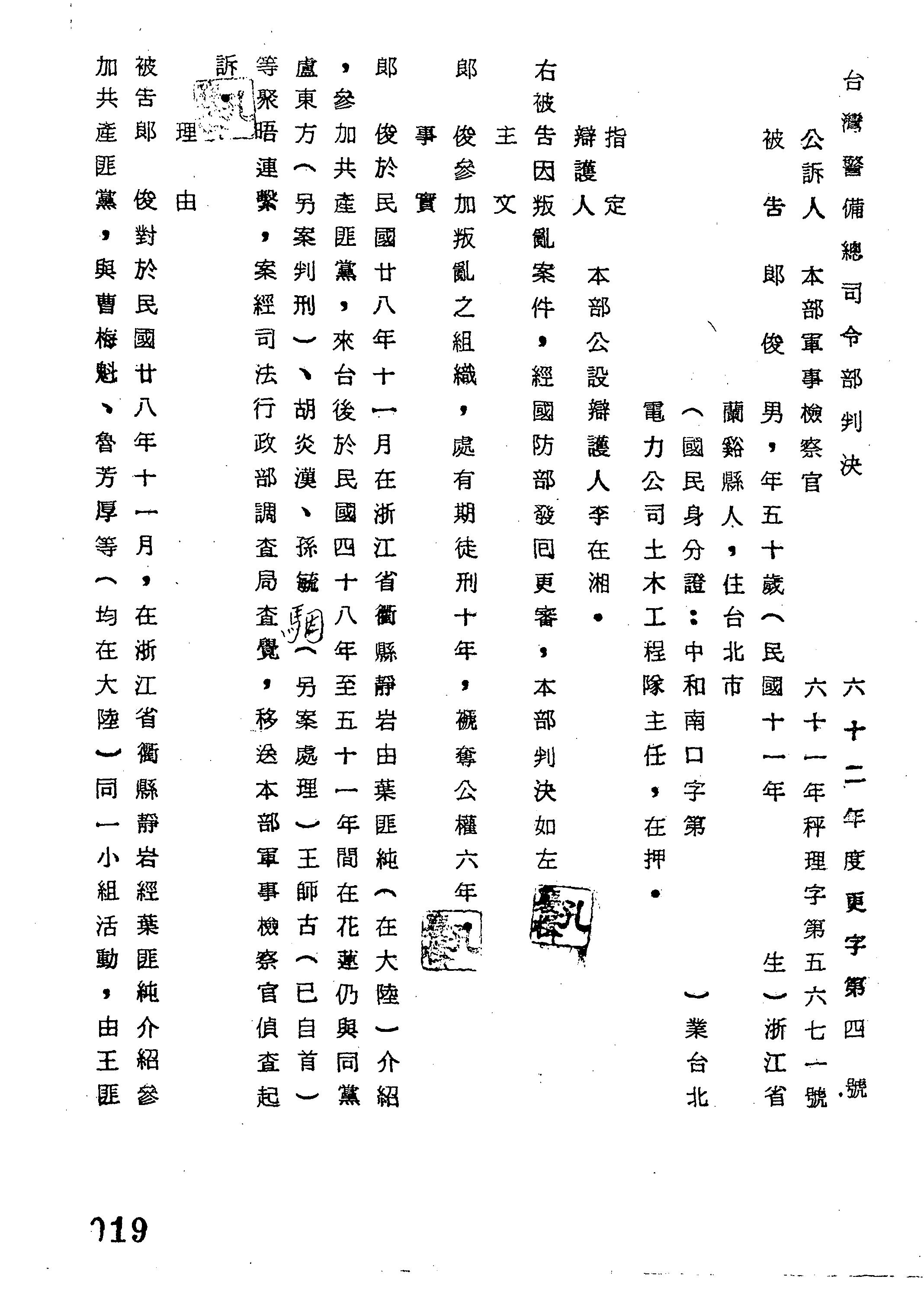 裁判書主文/要旨:郎俊「參加叛亂之組職」,處有期徒刑10年,褫奪公權6年。
