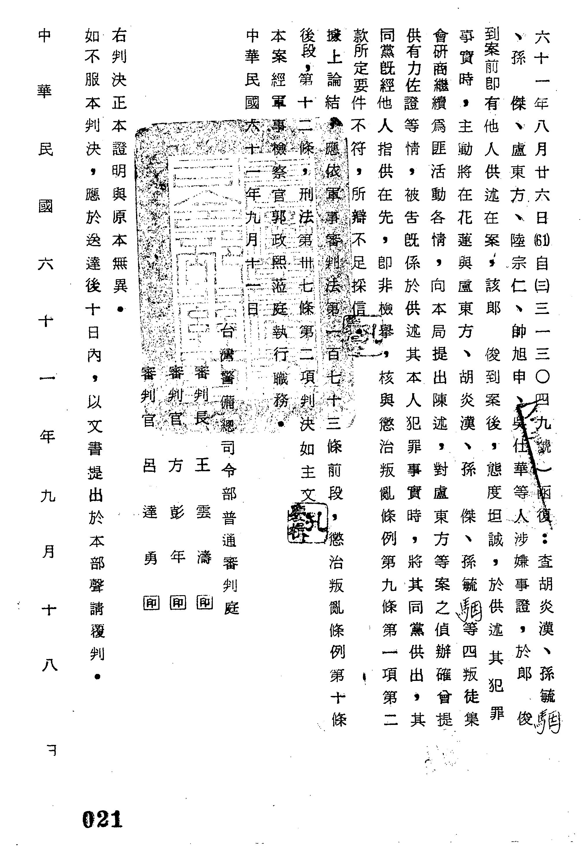 臺灣警備總司令部62年更字第0004號/61年秤理字第5671號判決書