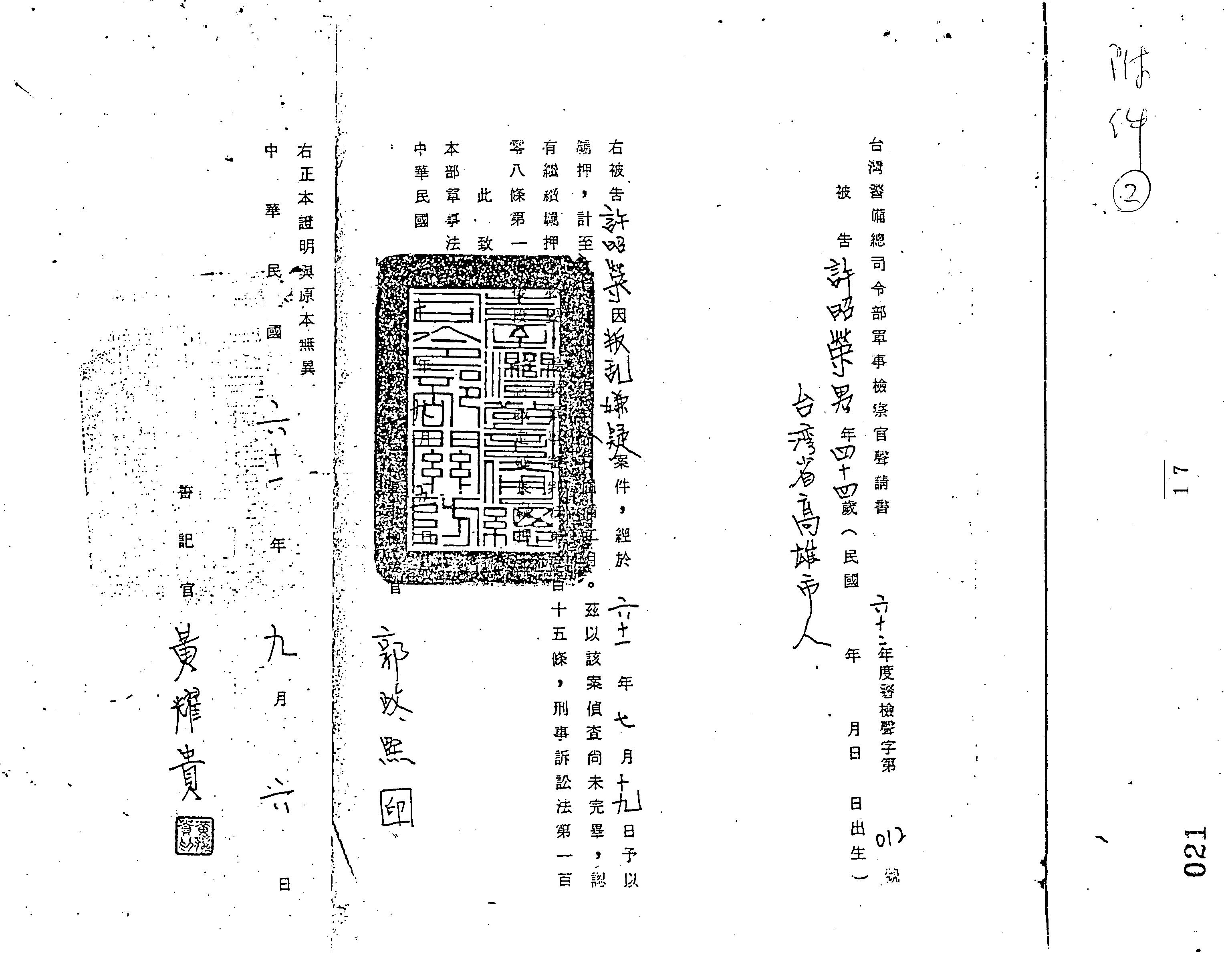 裁判書主文/要旨:許昭榮因叛亂嫌疑案件,偵查尚未完畢,認有繼續羈押之必要,聲請裁定延長羈押。