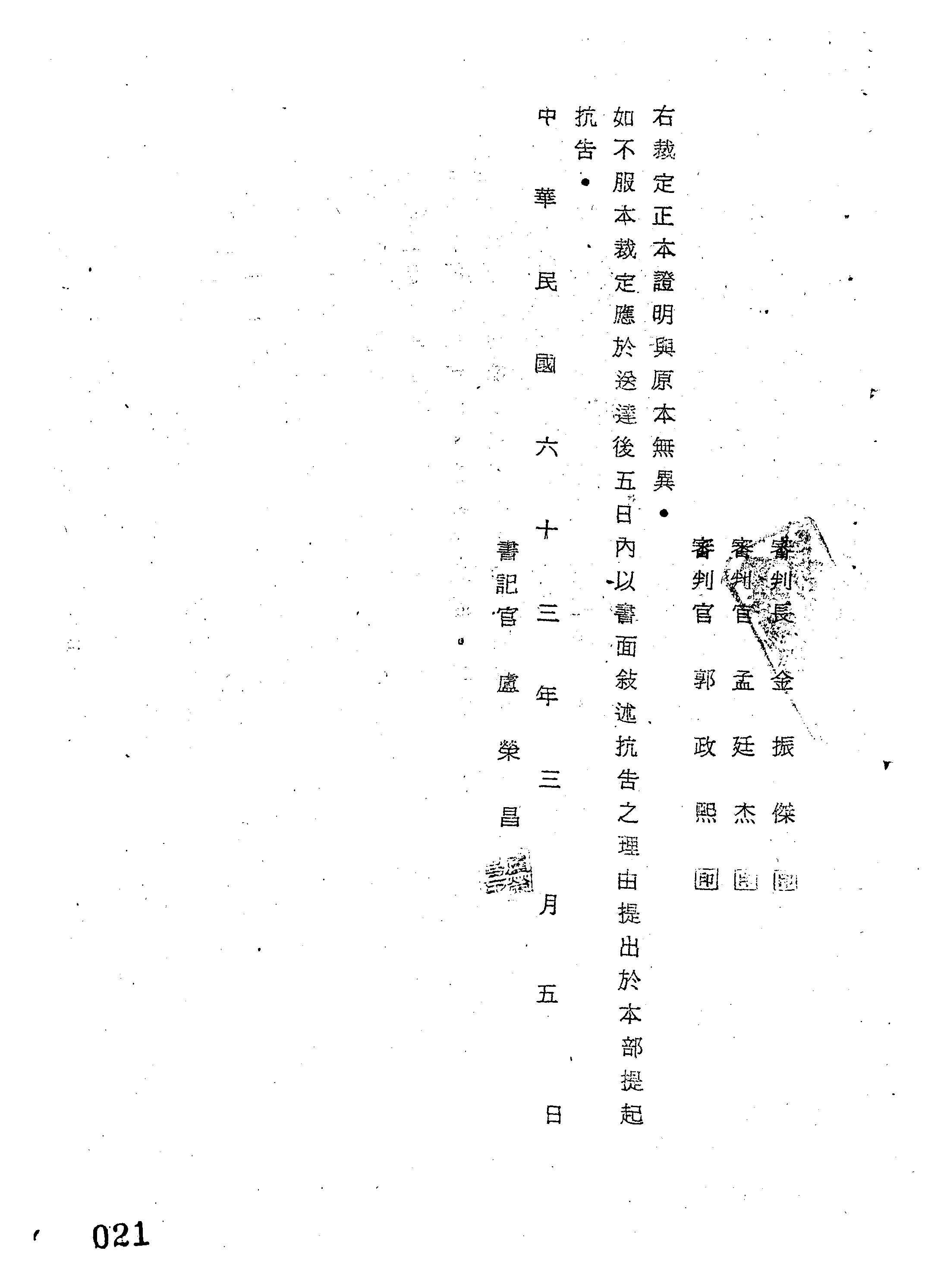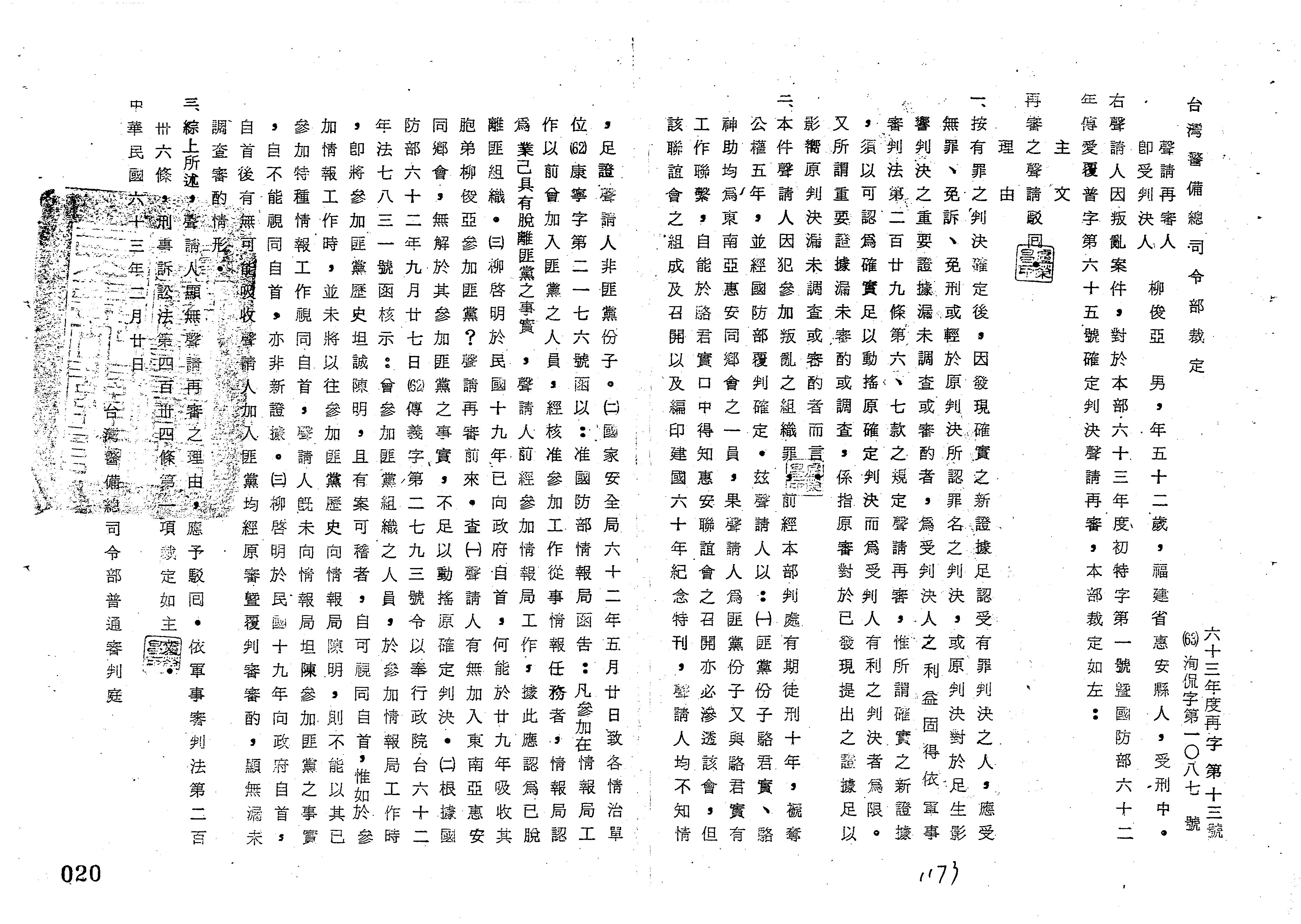 臺灣警備總司令部63年再字第0013號/63年洵侃字第1087號裁定書