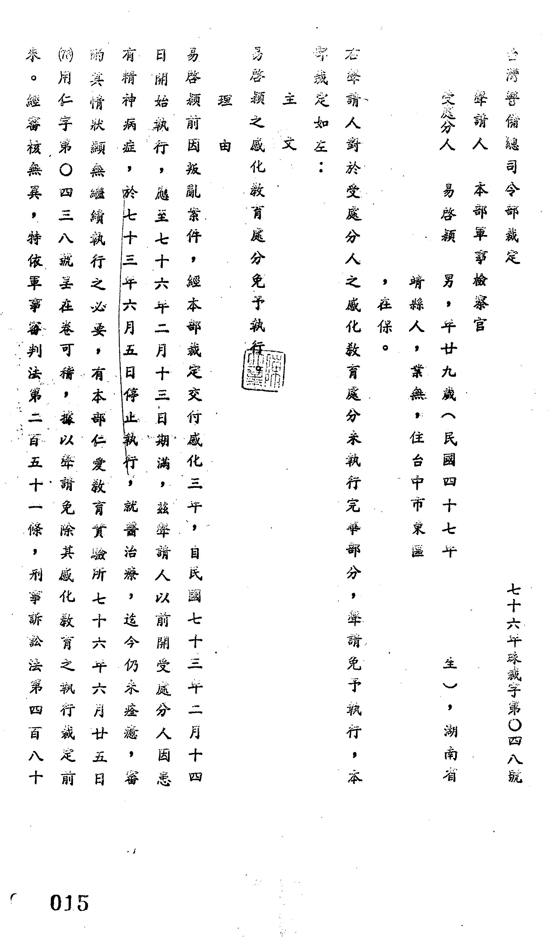 臺灣警備總司令部76年珠裁字第0048號裁定書