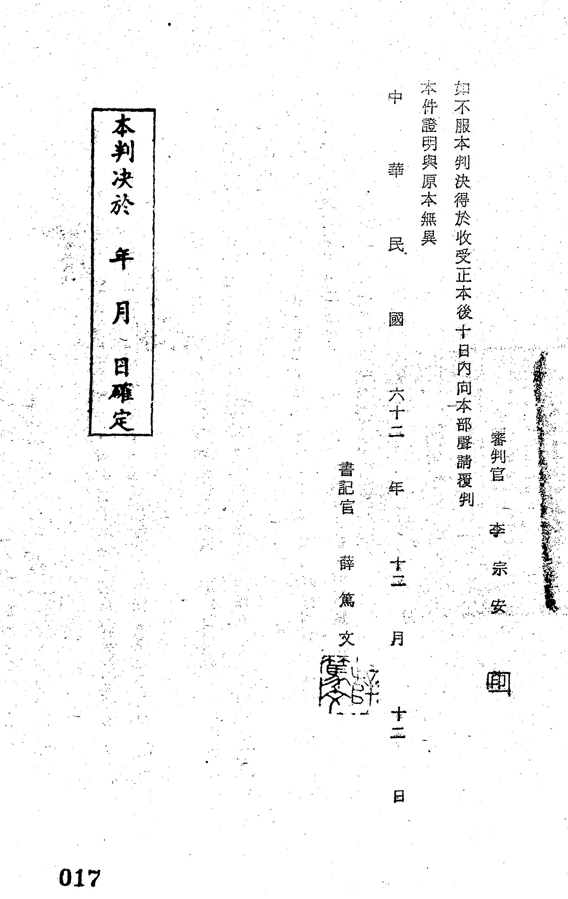 國防部62年傳仁字第0011號判決書