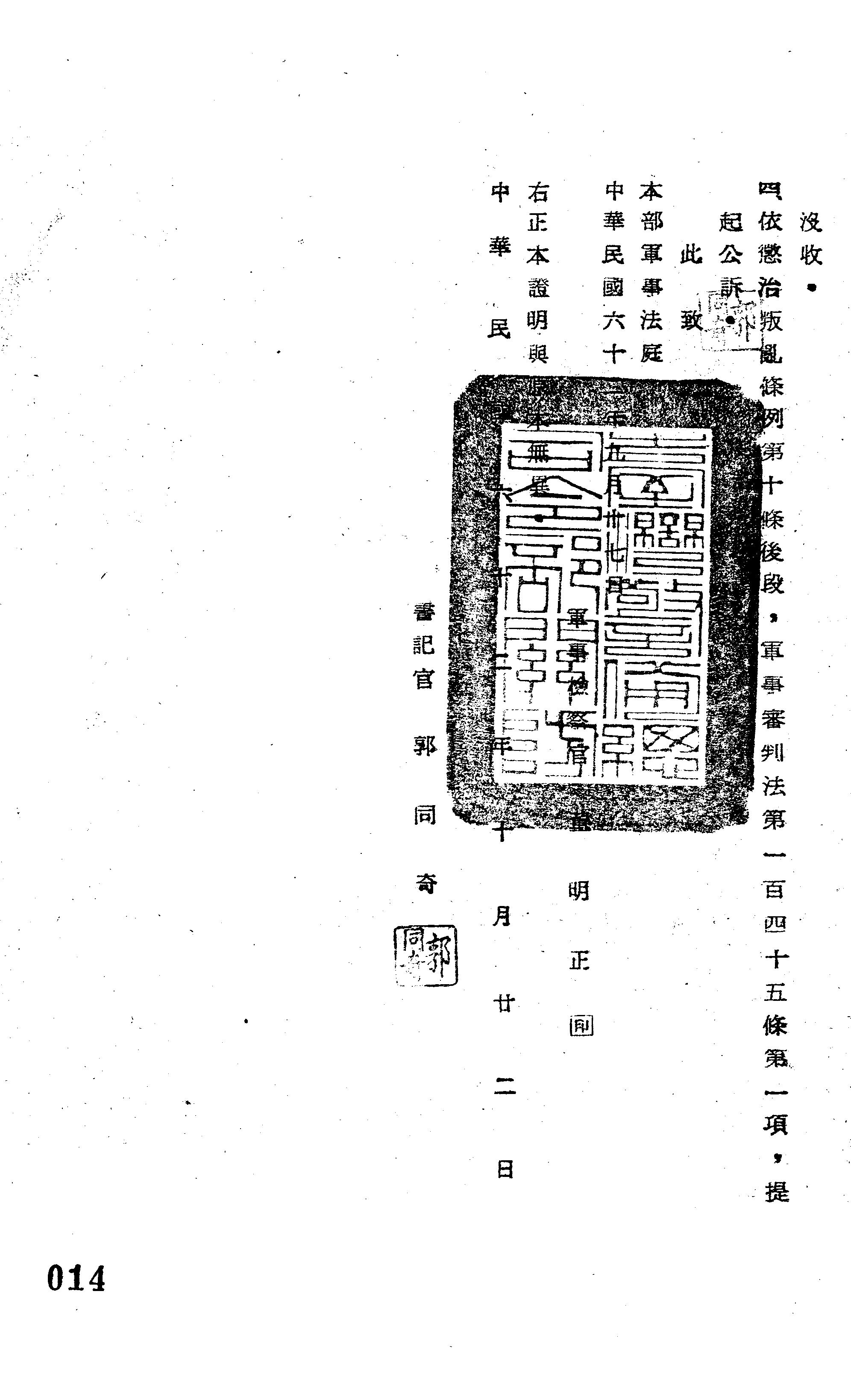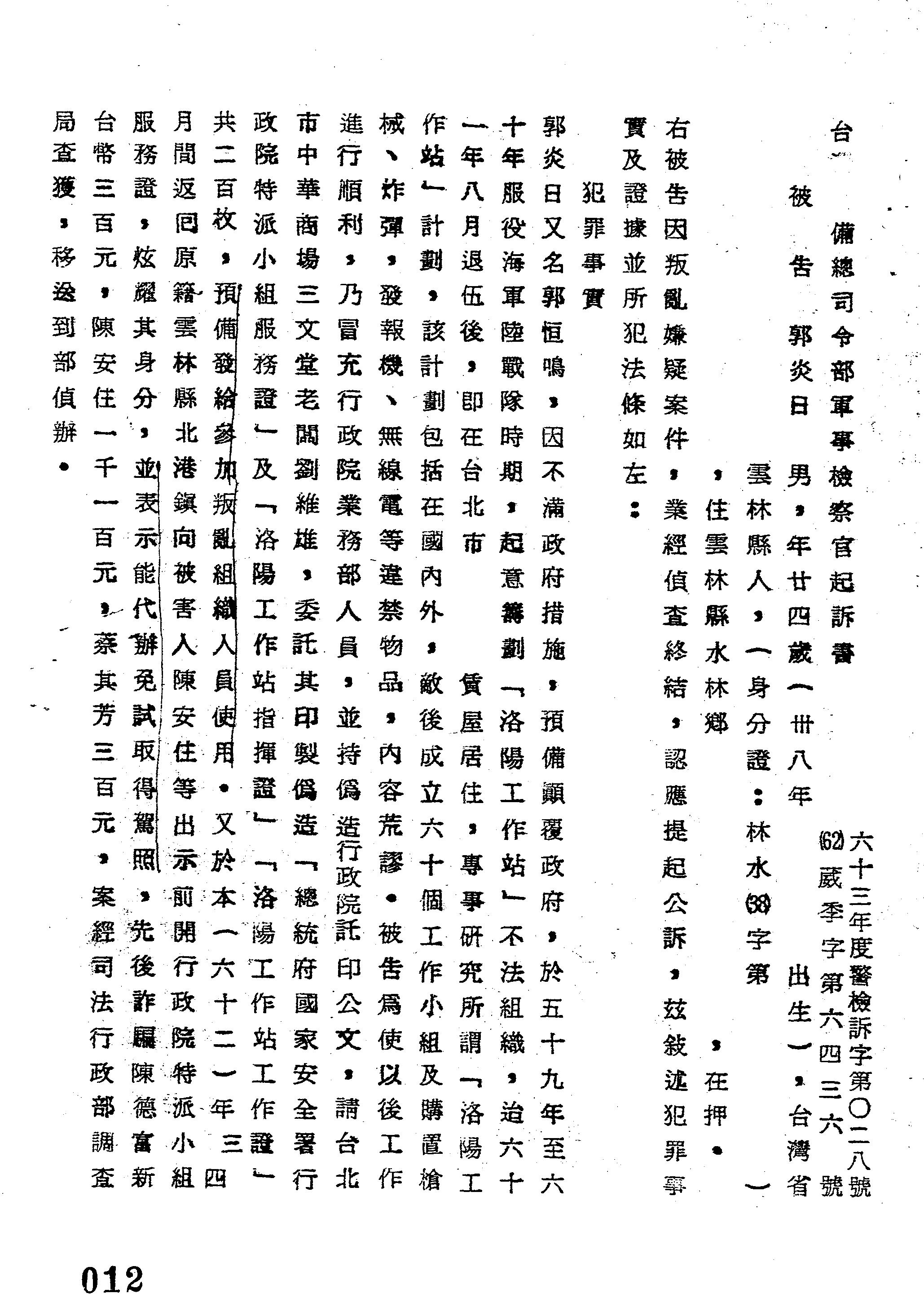 裁判書主文/要旨:郭炎日因叛亂嫌疑案件業經偵查終結認應提起公訴。