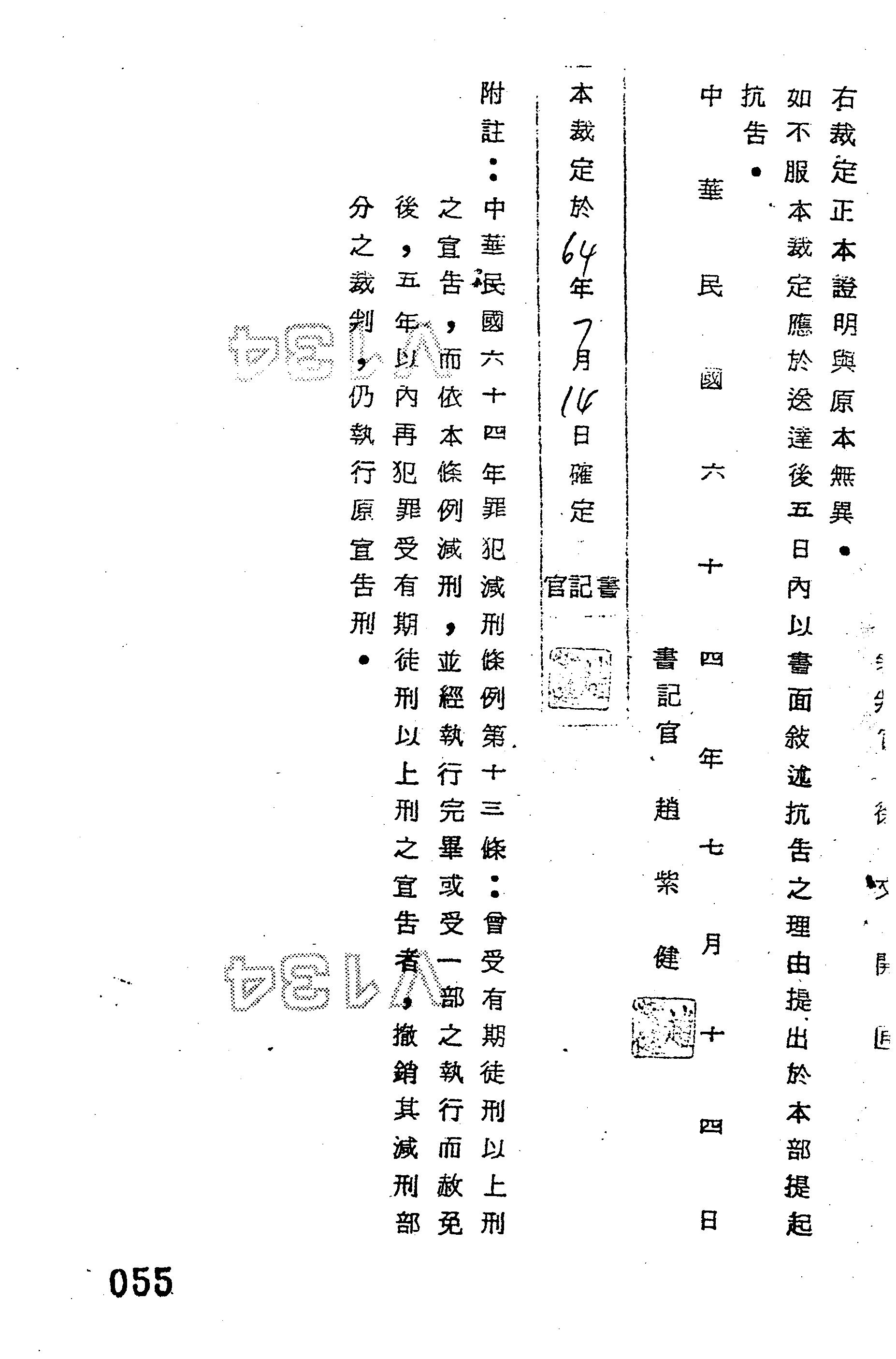 臺灣警備總司令部64年諫減字第0021號裁定書