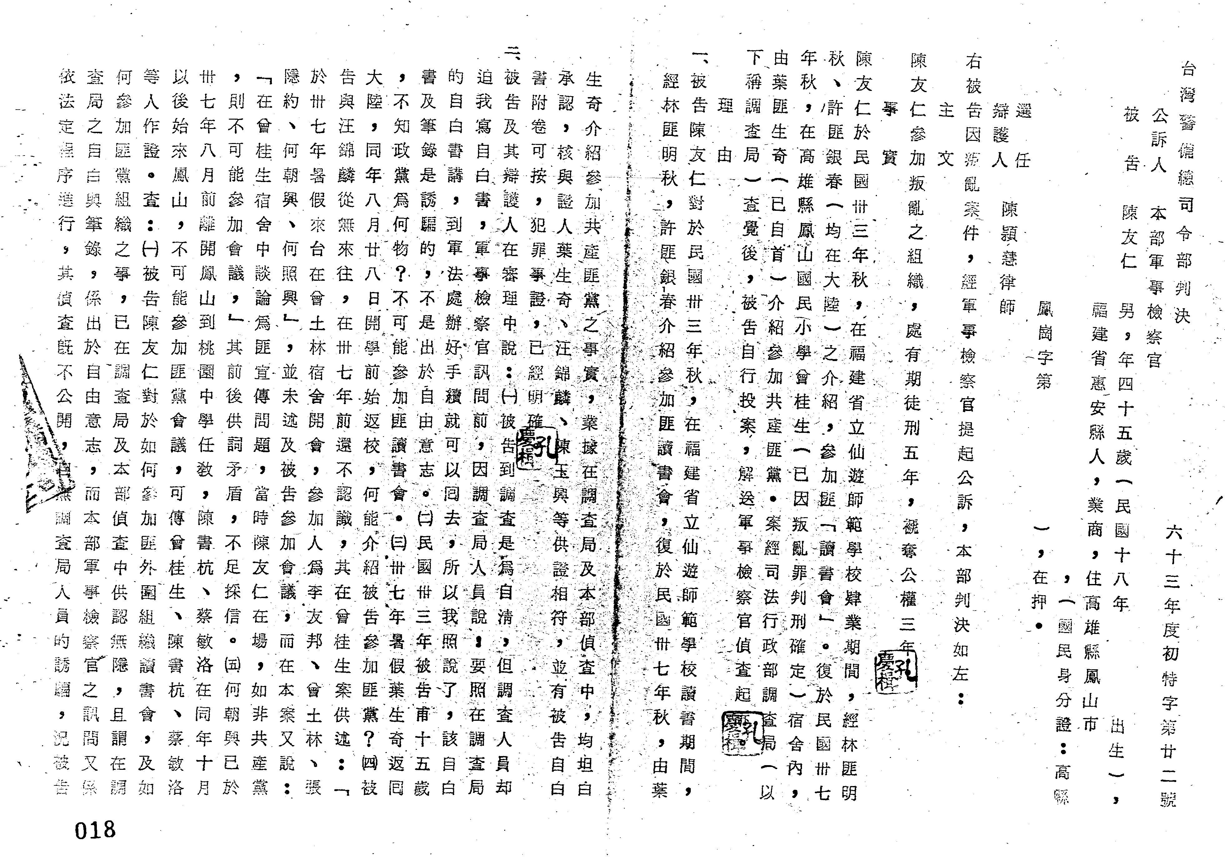 裁判書主文/要旨:陳友仁「參加叛亂之組織」,處有期徒刑5年,褫奪公權3年。
