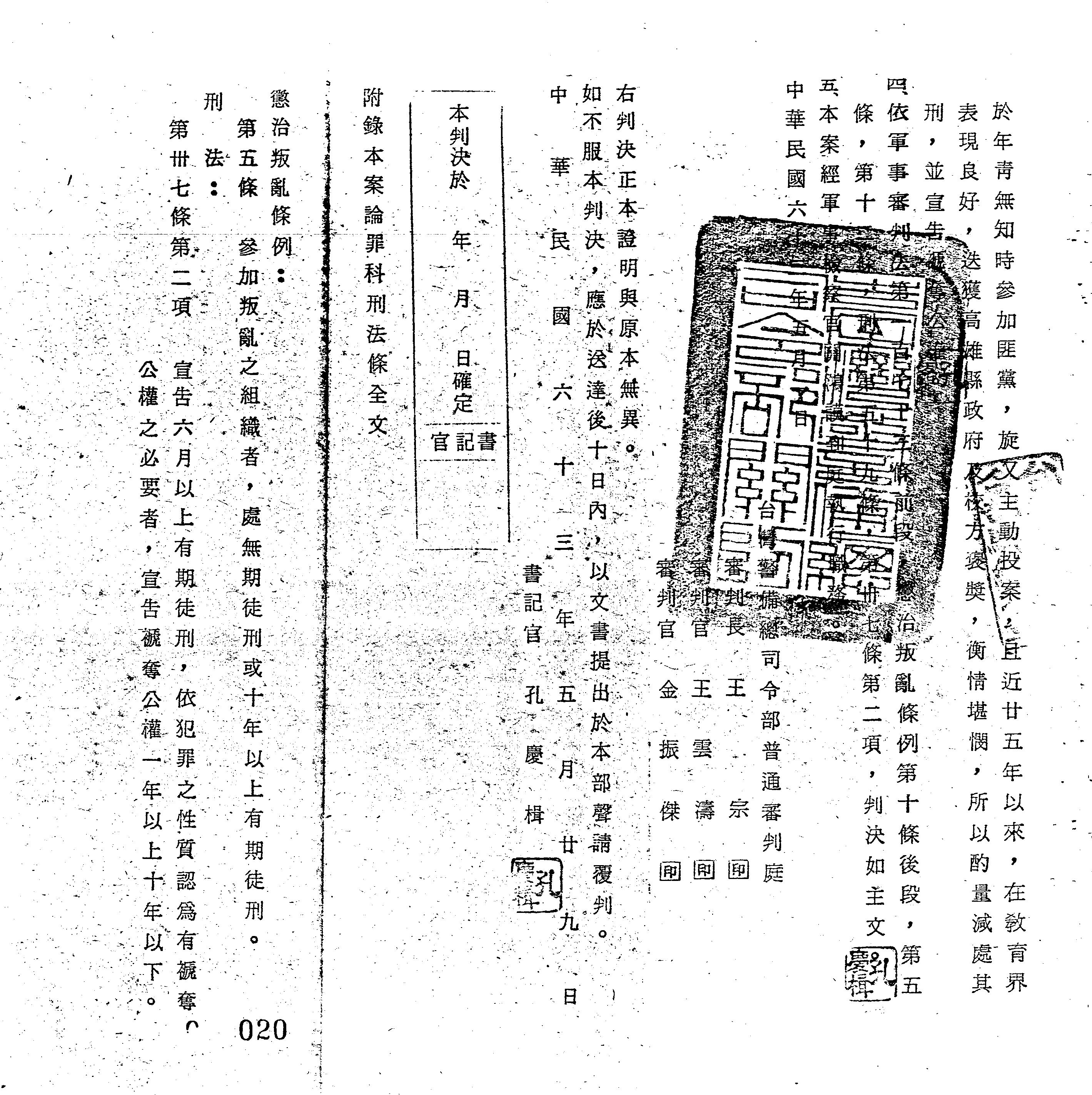 法條:軍事審判法第173條前段;懲治叛亂條例第10條後段、第5條、第12條;刑法第59條、第37條第2項