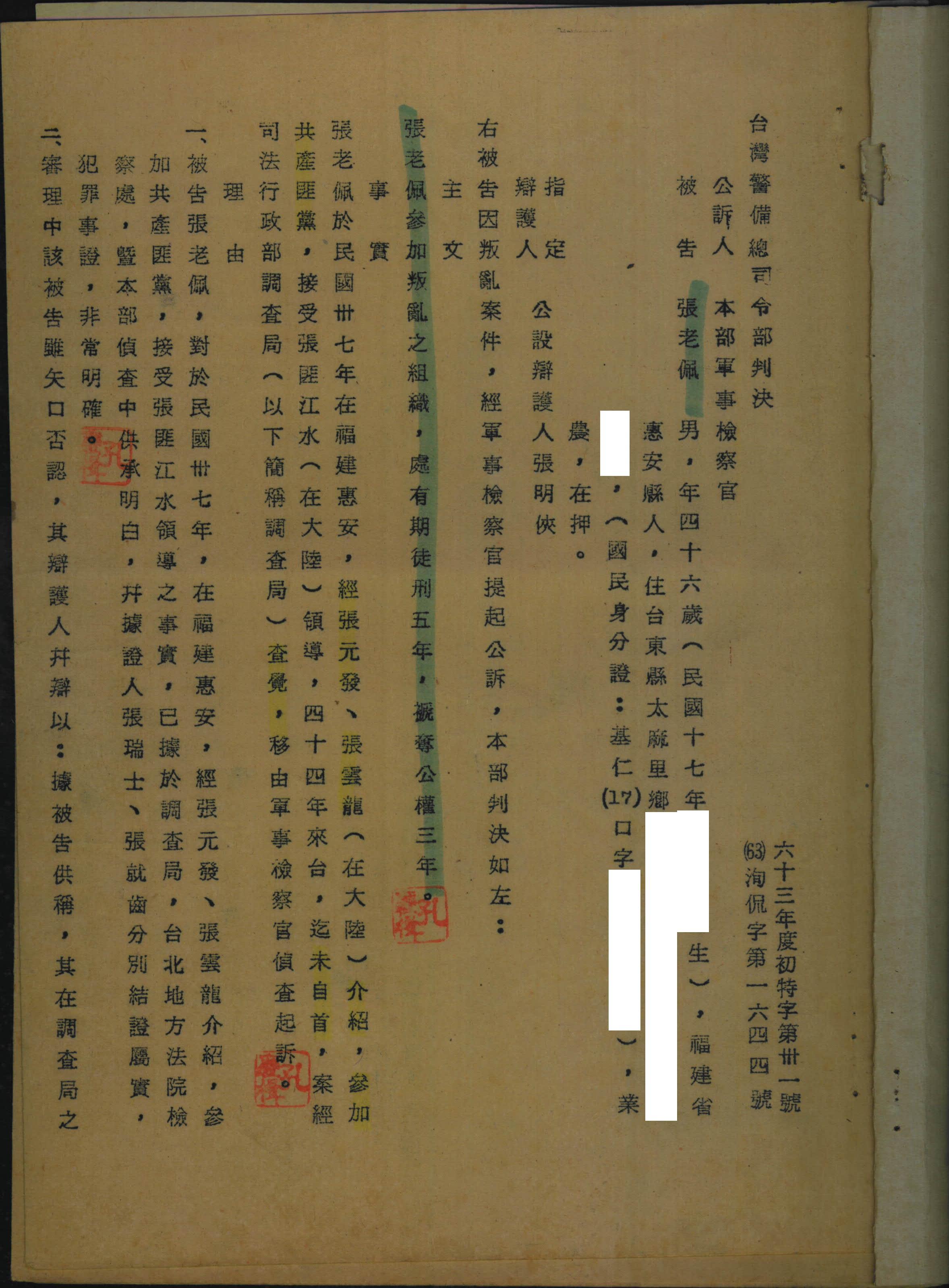 裁判書主文/要旨:張老佩「參加叛亂之組織」,處有期徒刑5年,褫奪公權3年。
