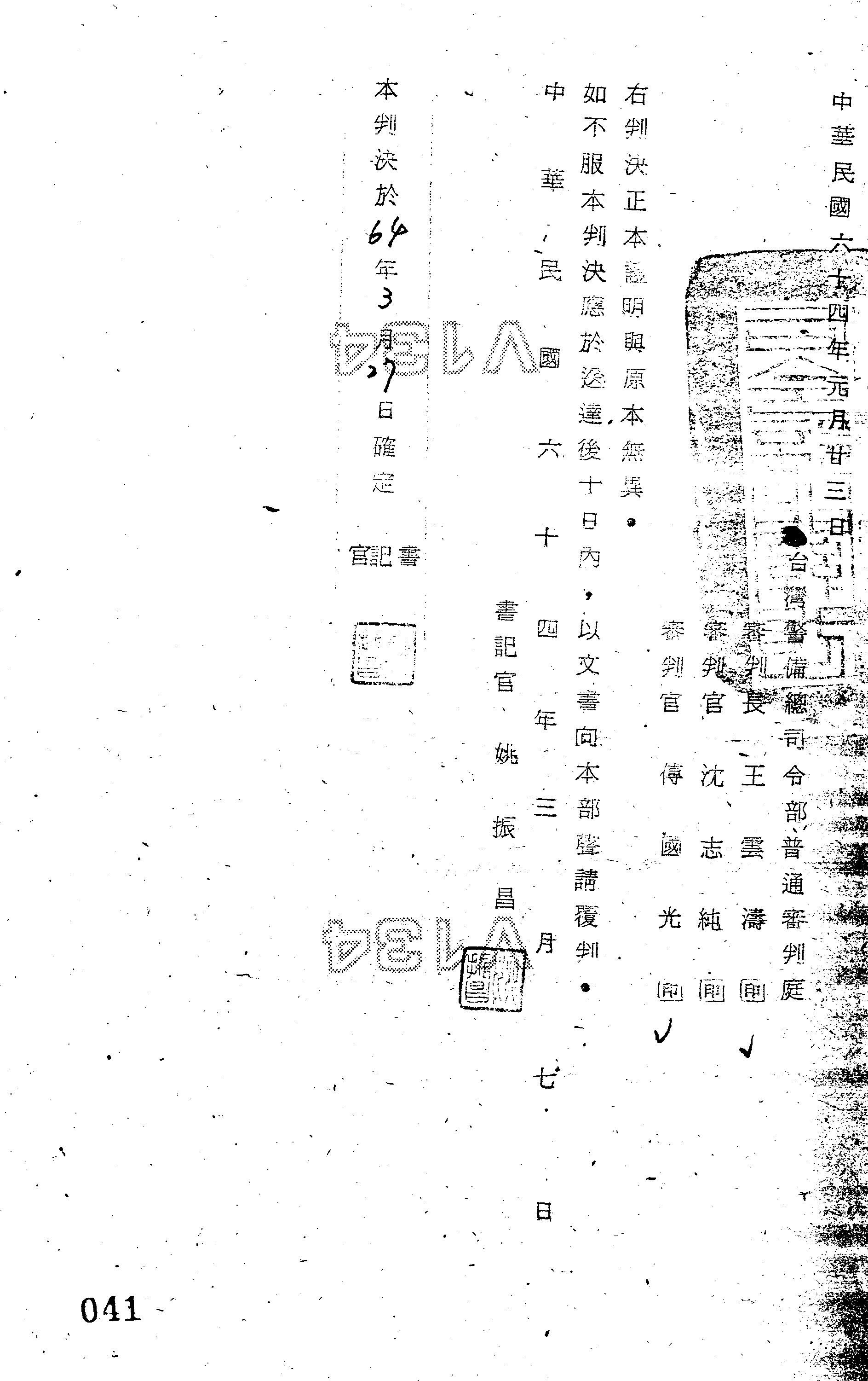 臺灣警備總司令部63年初特字第0061號判決書