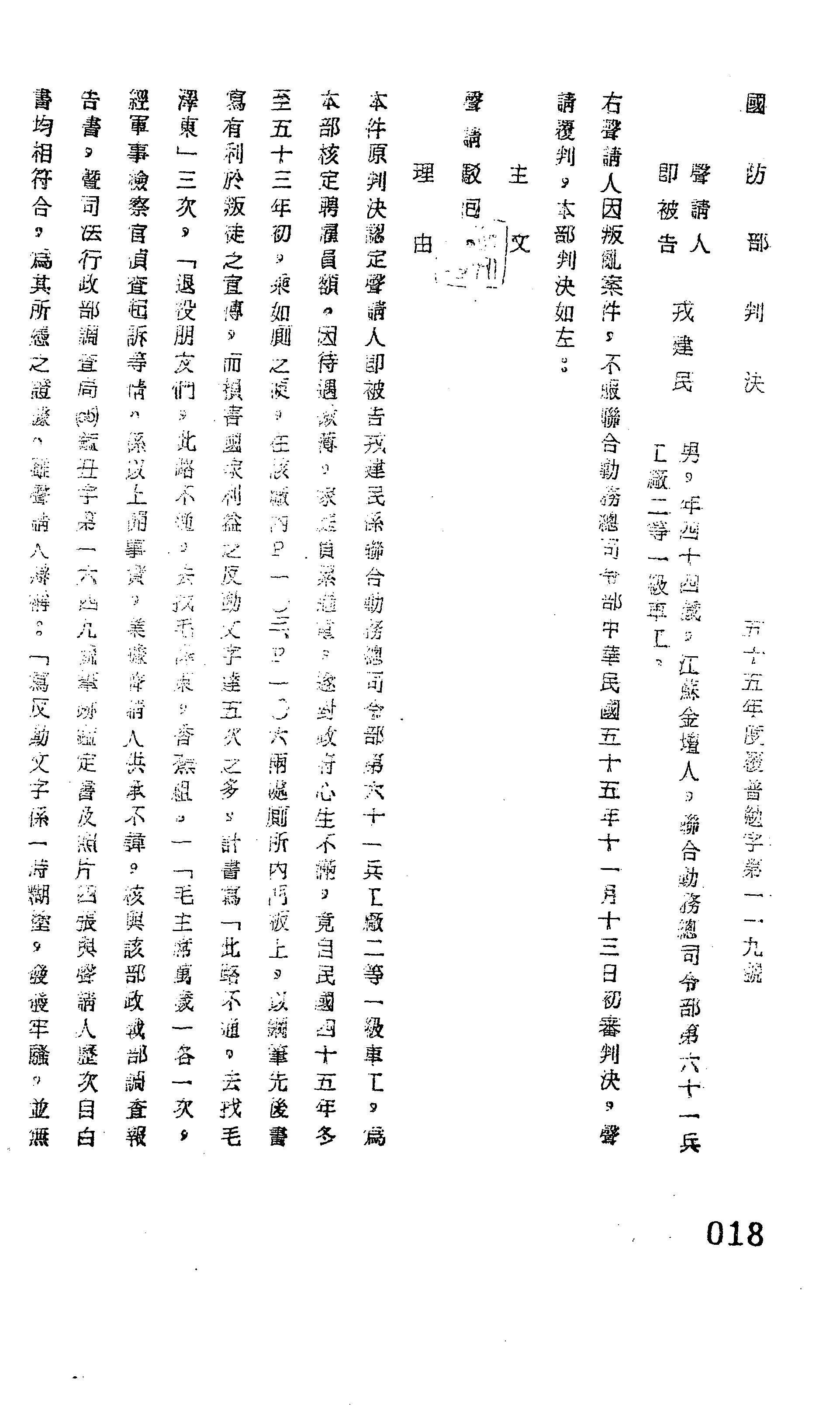 國防部55年覆普勉字第0119號判決書