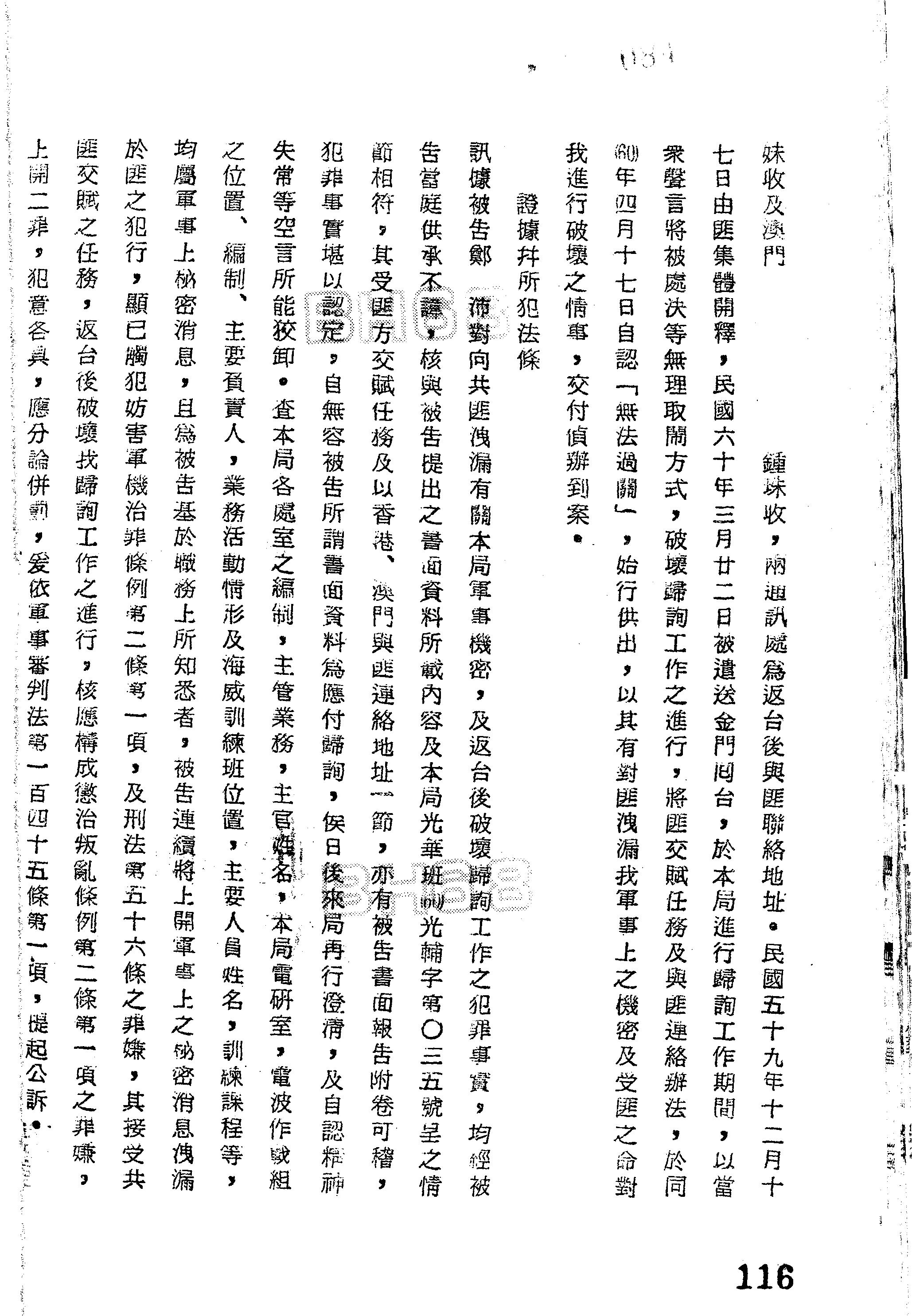 裁判書主文/要旨:鄭沛因民國六十年新檢字第○○七號妨害軍機等罪嫌一案業經偵查終結認應提起公訴。
