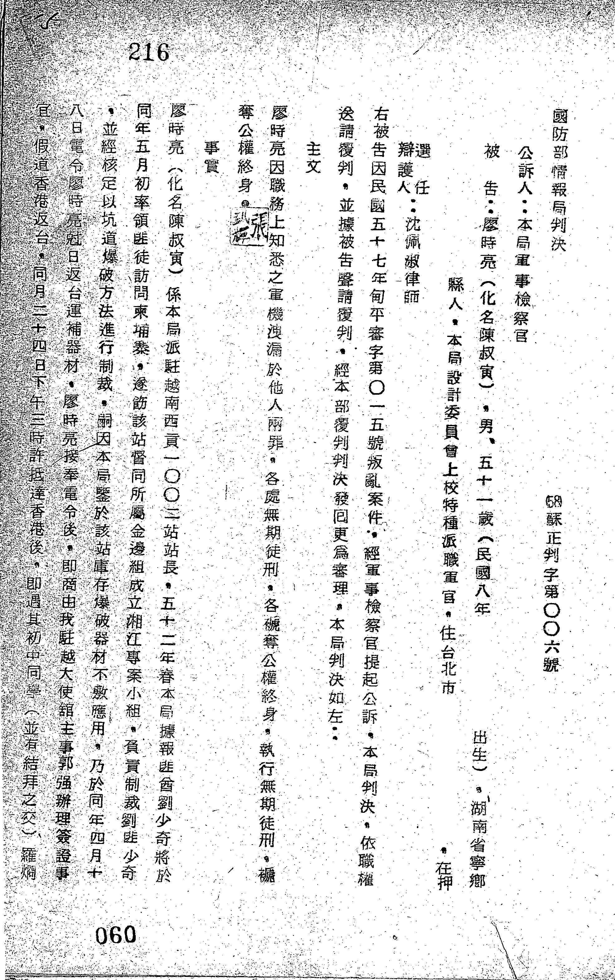 國防部情報局58年蘇正判字第0006號判決書