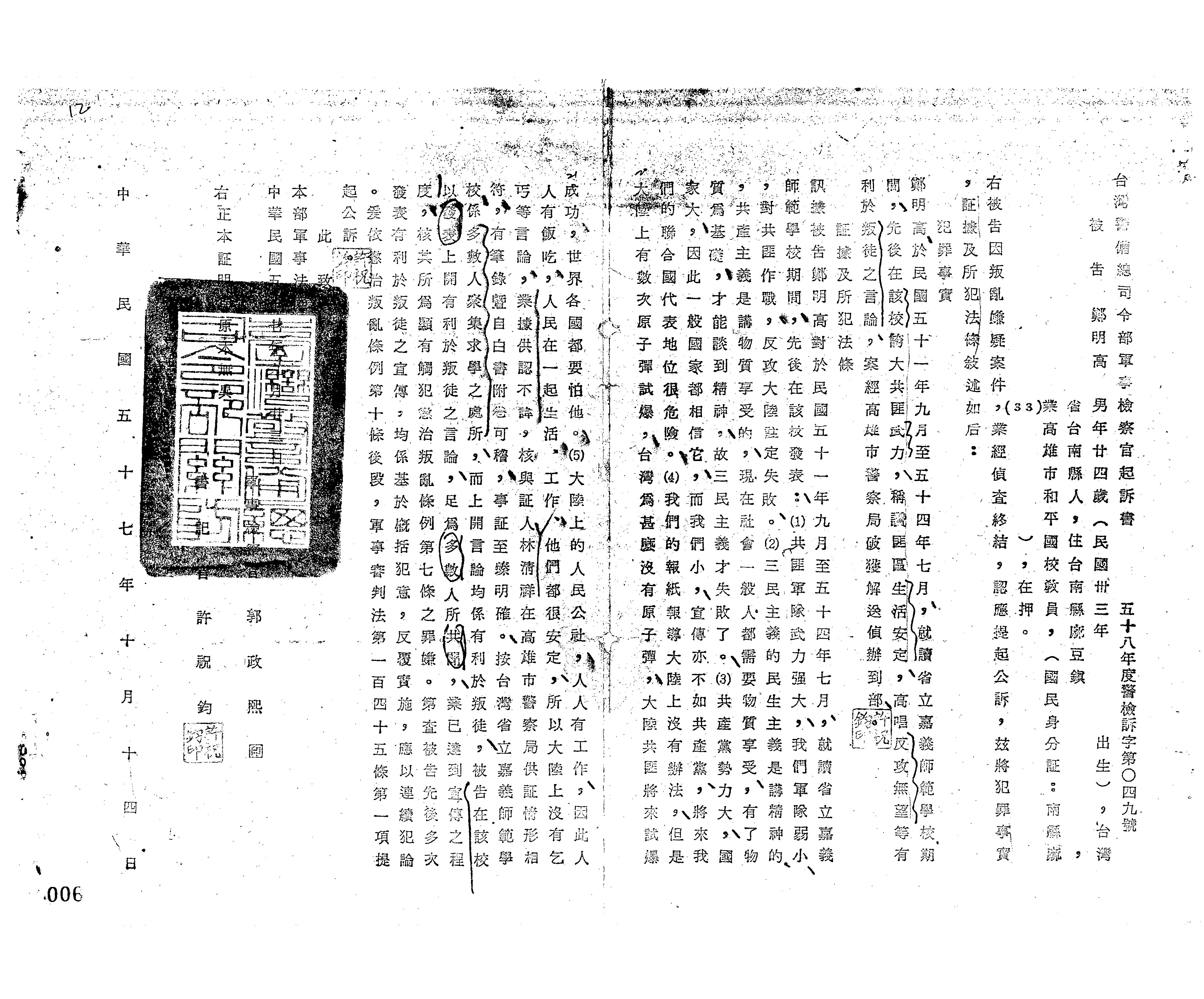 裁判書主文/要旨:鄭明高因叛亂嫌疑案件業經偵查終結認應提起公訴。