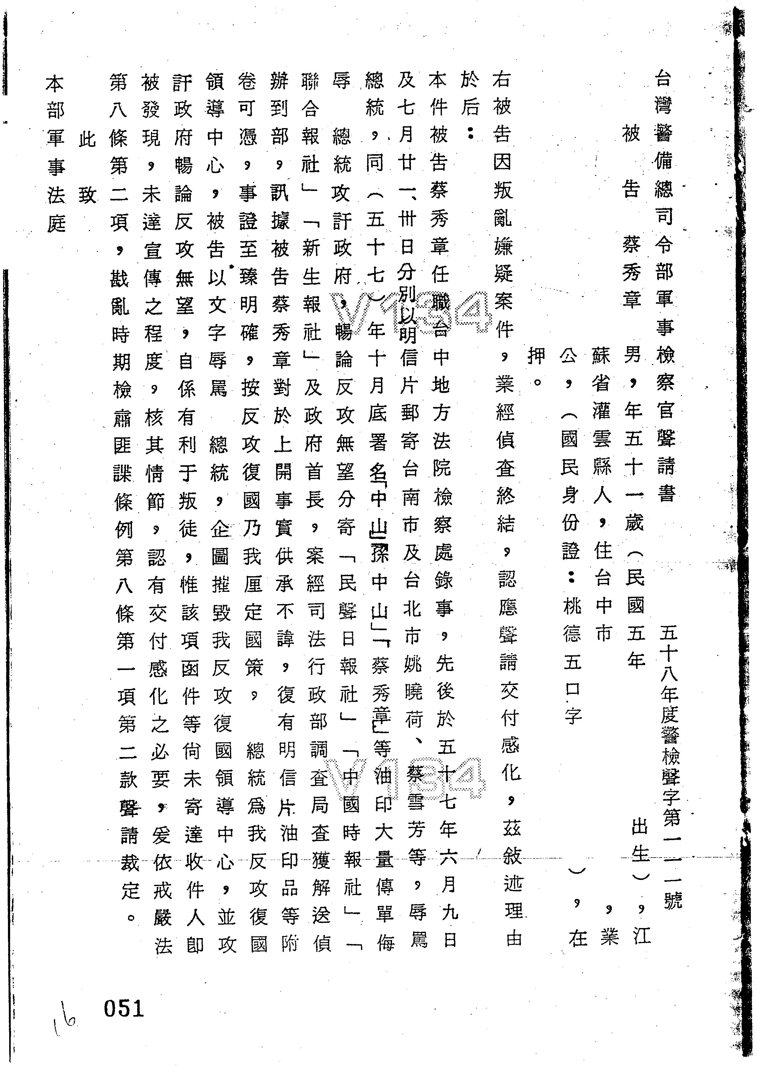 裁判書主文/要旨:蔡秀章因叛亂嫌疑案件,業經偵查終結,認應聲請交付感化。