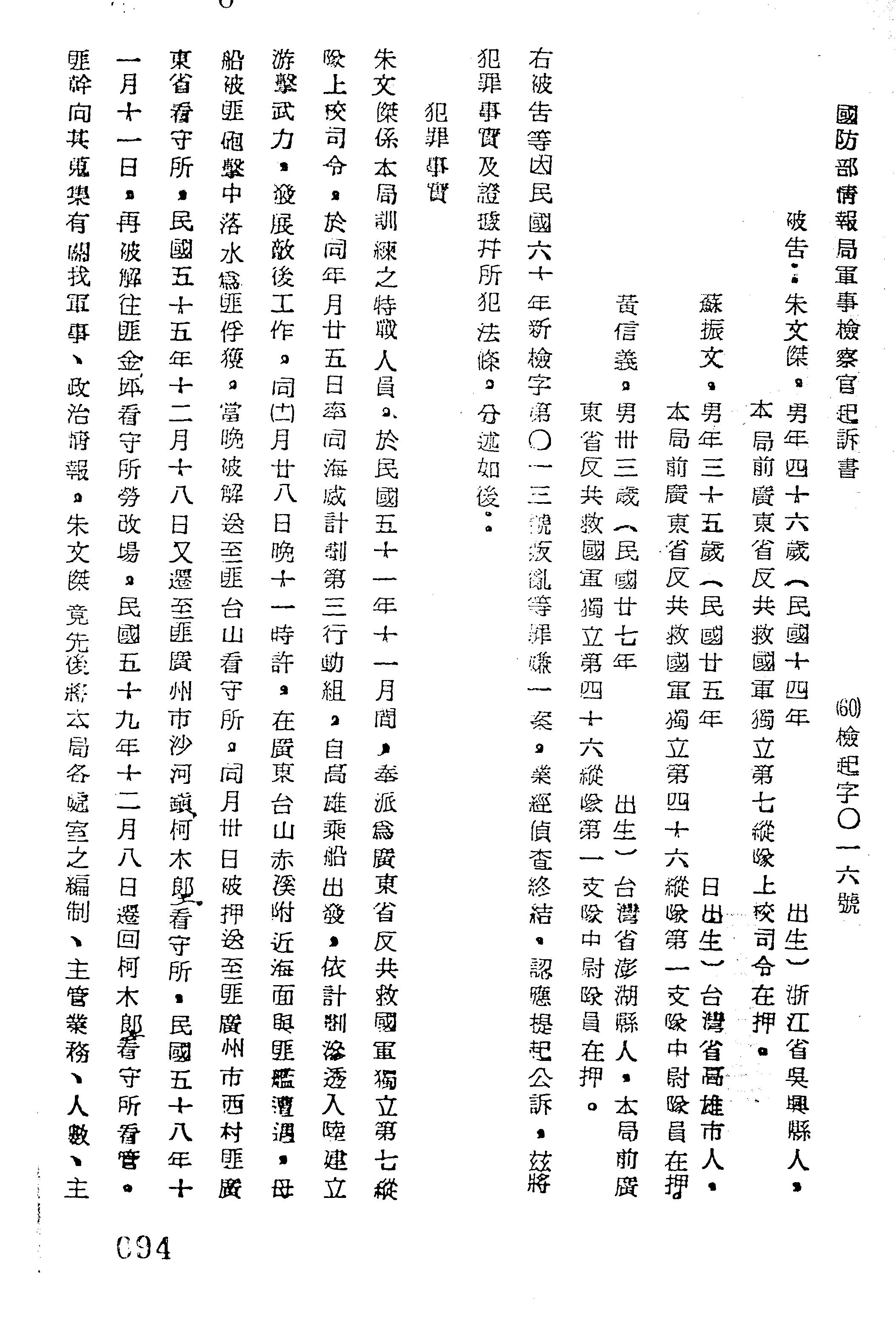 國防部情報局60年檢起字第0016號軍事檢察官起訴書