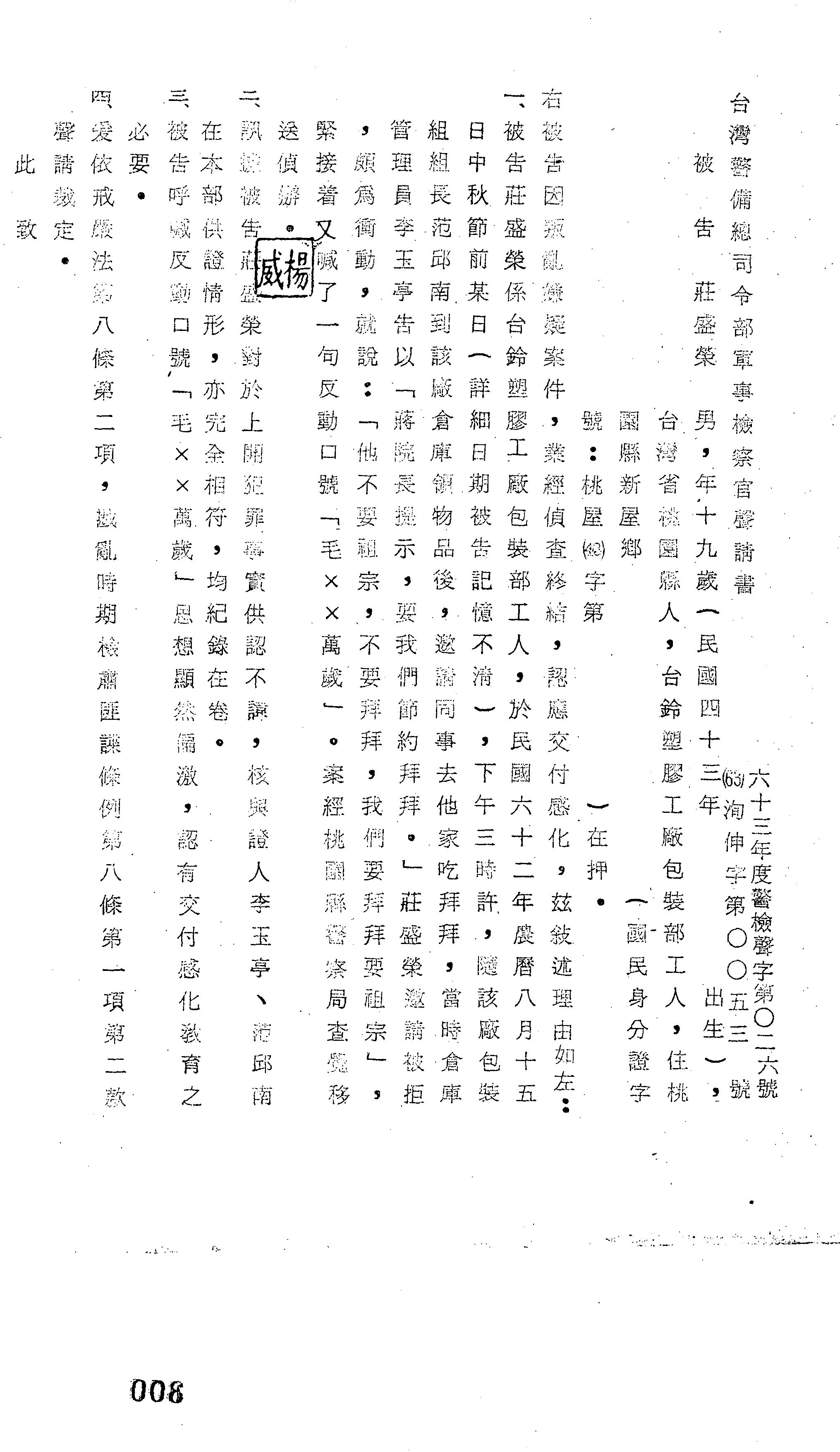 臺灣警備總司令部63年警檢聲字第0026號/63年洵伸字第0053號軍事檢察官聲請書