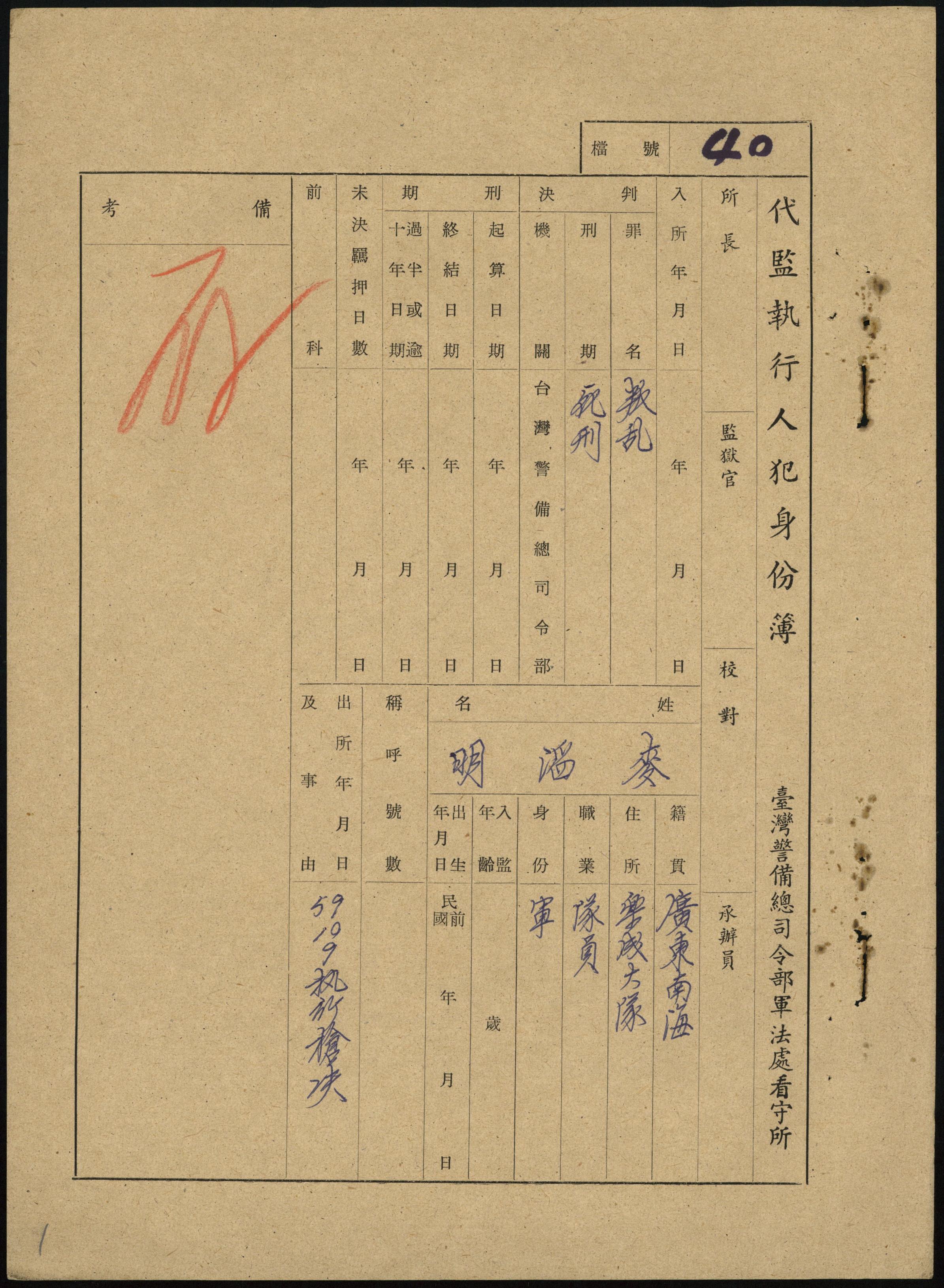 - 當時職業: 陸軍樂成大隊第一中隊隊員