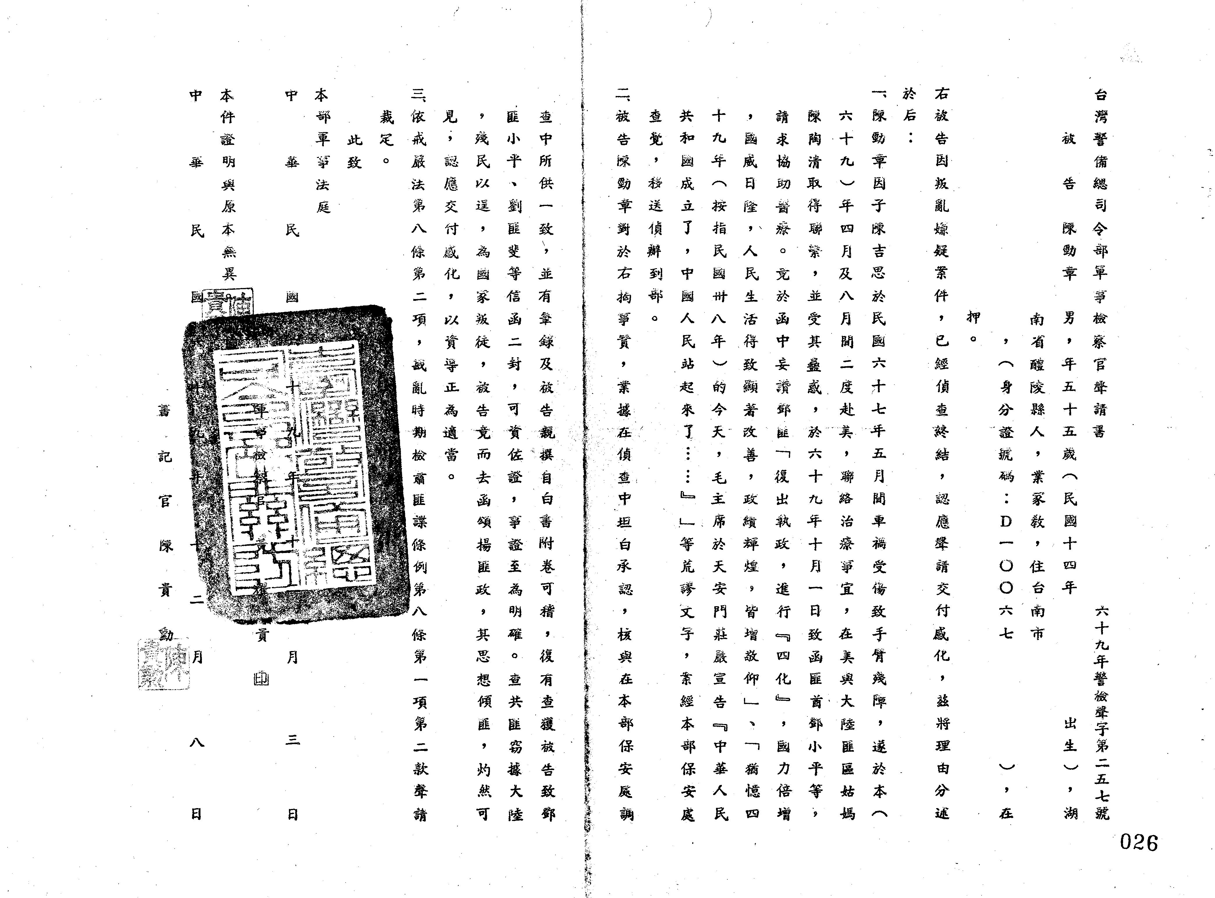 依(70)障裁字第04號裁定書,案發時為家教,其二度赴美,為其子尋求醫療事宜,曾與大陸之姑媽陳陶清連繫,受其宣揚匪區醫學進步等之蠱惑,復致函鄧小平,請求其協助前往醫療,並於函中書寫讚揚鄧小平之文字。1980年11月19日被羈押。1981年經臺灣警備總司令部以《戡亂時期檢肅匪諜條例》第8條第1項第2款、《刑法》第92條裁定交付感化3年,以保護管束代之。1981年2月4日開釋。