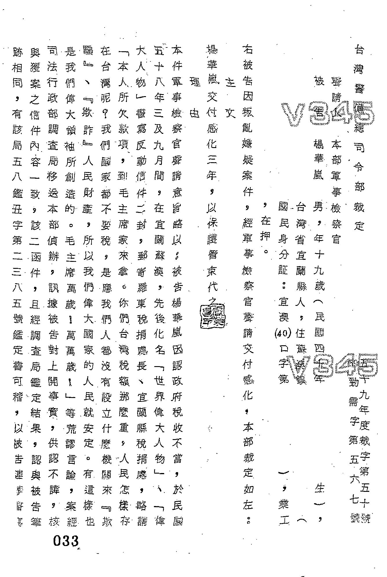 依(59)裁字第50號裁定書,案發時為工人,其先後以化名「世界偉大人物」、「偉大人物」書寫反動信件2封,郵寄羅東稅捐處長、宜蘭縣稅捐處,略謂「本人所欠款項,到毛主席家來拿。你們臺灣稅額那麼重,人民怎樣存在臺灣呢?我們國家都不要稅,是應我們人都沒有設立什麼機關來『欺騙』、『欺詐』人民財產,所以我們偉大國家的人民就安定。有這樣也是我們偉大領袖所創造的。毛主席萬歲!萬萬歲!」等言論。1969年11月22日被羈押。1970年經臺灣警備總司令部以《戡亂時期檢肅匪諜條例》第8條第1項第2款裁定交付感化3年,以保護管束代之。1970年2月28日交其父領回保護管束。